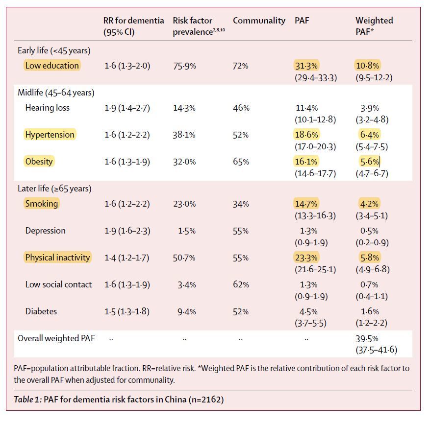 从表种可以看出,造成中国痴呆发生的可控因素种,儿童时期受教育程度低是占比最高的,在可控因素中占到31.3%,在所有因素中也占了10.8%。