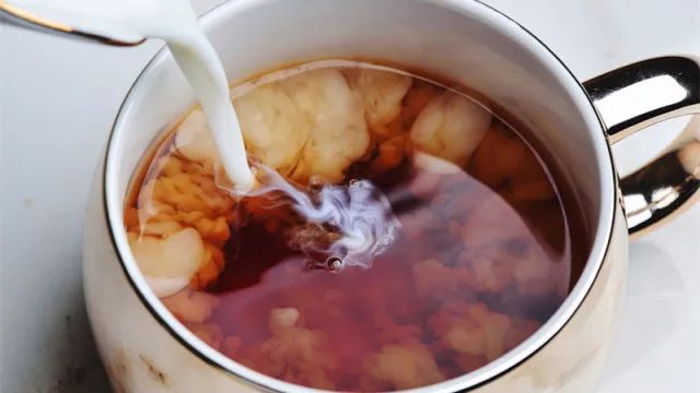 将茶水按照传统冲泡好后,按照一比一的比例将其与牛奶进行搭配。将冲泡好的黑茶加入牛奶,制成奶茶,口感醇和润滑。