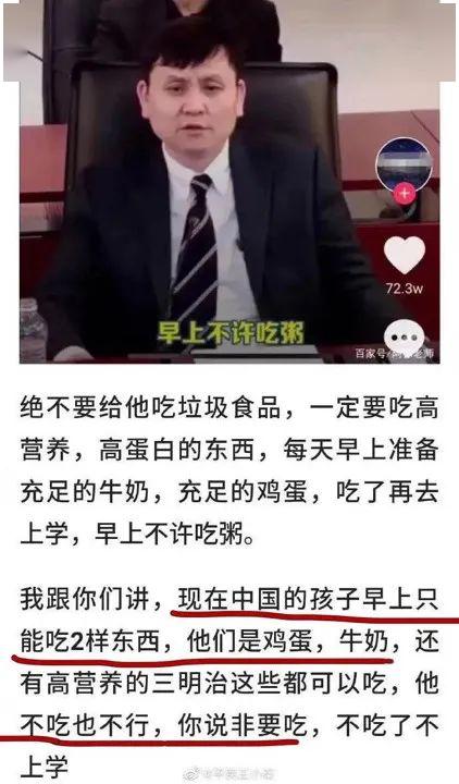 主题思想是:现在中国的孩子早上只能吃鸡蛋喝牛奶,不许吃粥。